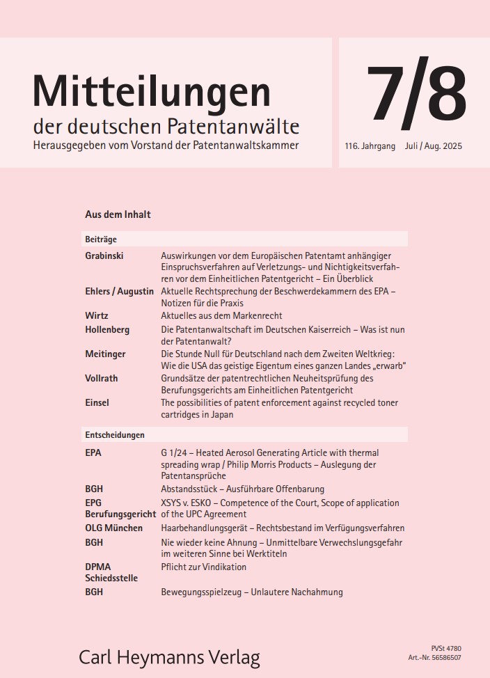 In der Juni-Ausgabe des Jahres 2024 weist Dr. Meitinger auf die Besonderheit hin, dass der Unterlassungsanspruch aus einem Patent von den Gründungsvätern des deutschen Patentgesetzes nicht gewollt war.